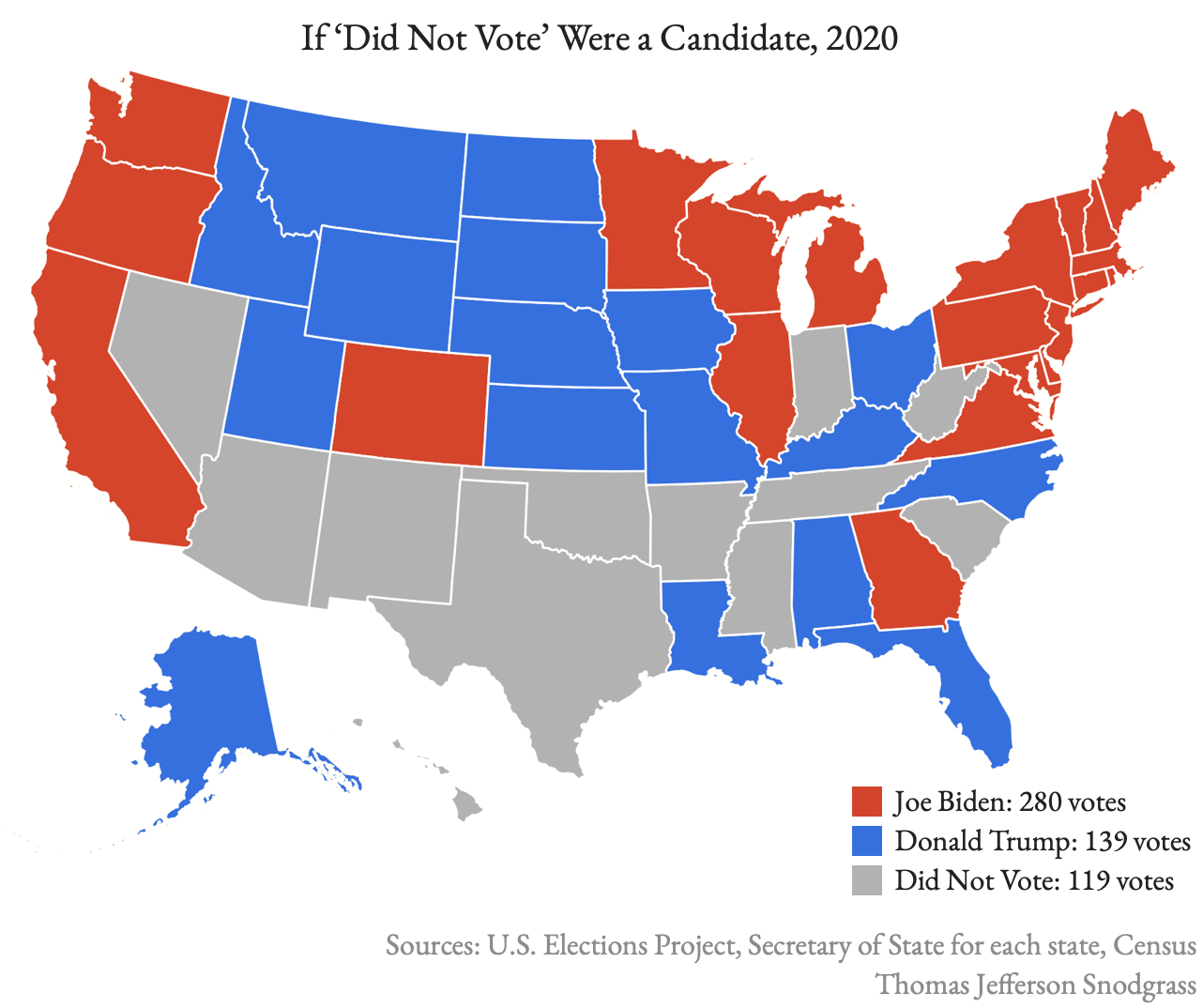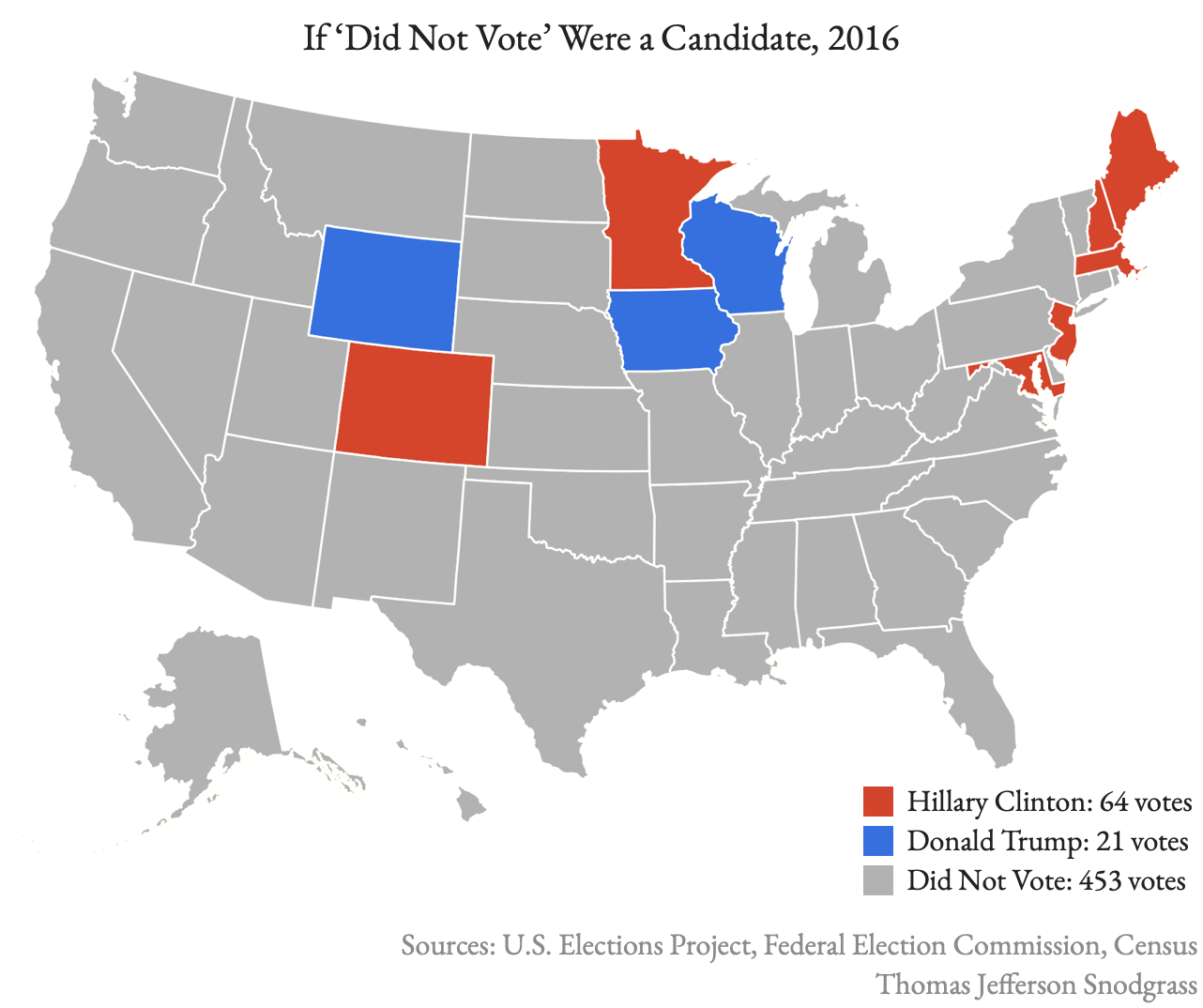 This can be seen most starkly if we tally electoral votes as if Did Not Vote—representing the eligible voters who for one reason or another abstained—were a candidate. Think of it as a kind of no confidence vote. The maps look quite different between 2016 and 2020.Note that Maine and Nebraska allocate some votes by congressional district. These aren’t depicted on the map, but are part of the vote tallies. And most recent elections look like the former, with Did Not Vote carrying most states.