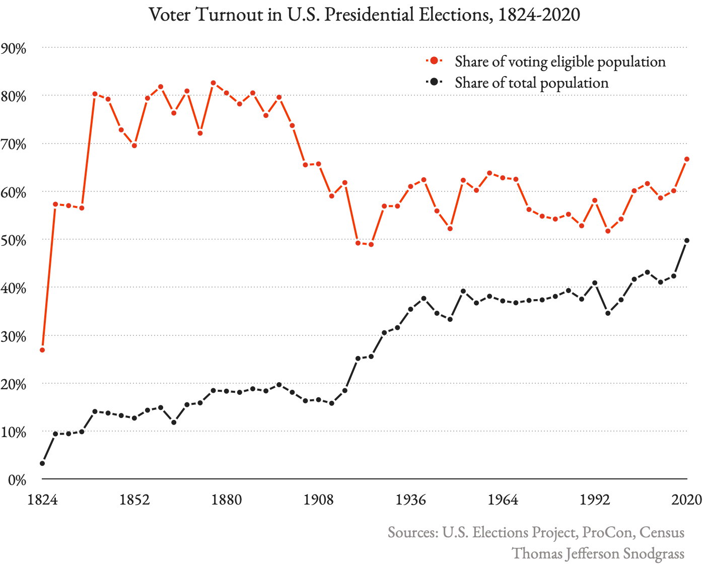 Public participation is typically considered a key marker, if not the marker, of civic health in a liberal democracy. If we look at election turnout over time, both as a percentage of eligible voters and as a percentage of the total population, we might conclude that we’re at a high watermark for civic participation, and that the country is on surer footing than it’s ever been.