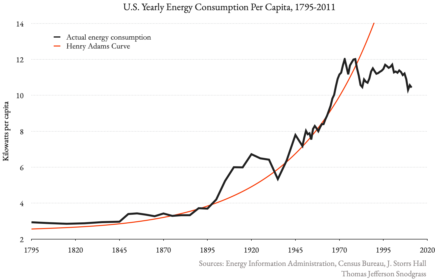 Hall, following famed historian Henry Adams, observes that there is a long trend in history “going back at least to the Newcomen and Savoury engines of 300 years ago” of usable energy following an exponential curve. Energy use doubled every ten years as a function of population growth, improved energy efficiency, and increased energy consumption. Hall calls it the Henry Adams Curve. “The optimism and constant improvements of the 19th and first half of the 20th centuries can quite readily be seen as being predicated on it.”
