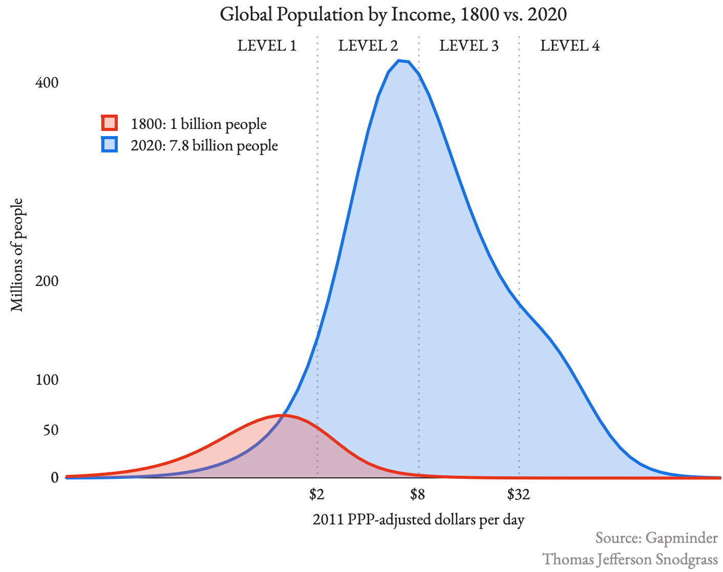 - Roughly three billion people live on Level 2, between $2 and $8 a day. If you live on Level 2, you can afford food that you didn’t grow yourself, and can buy sandals for your children and a bicycle for travel. Your children attend school, you cook over a gas stove, and you sleep on a mattress.