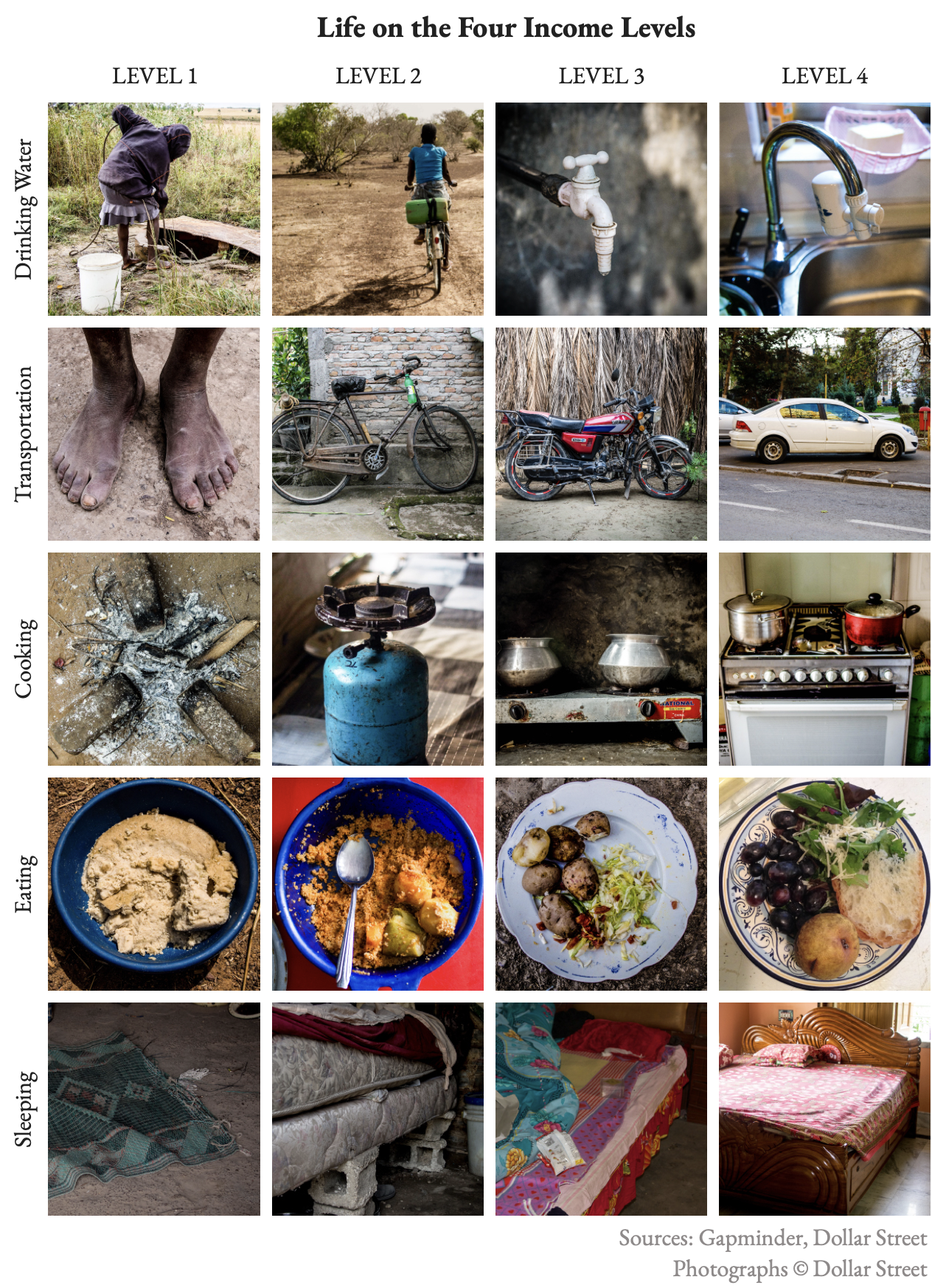 - Roughly one billion people live on Level 1. On Level 1, you live in extreme poverty, surviving on less than $2 a day. Your children walk hours each day with a plastic bucket to fetch water. You travel barefoot and cook your food over an open fire. Your family eats the same meager porridge for nearly every meal, and sleeps on a dirt floor.
