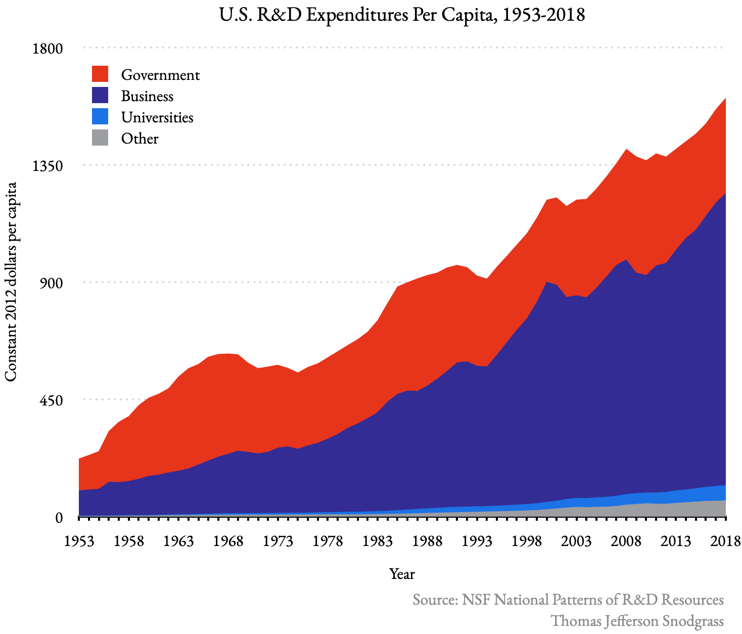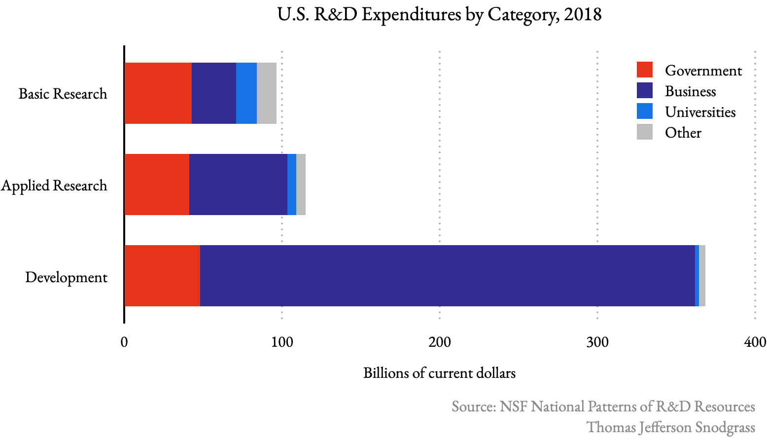 While businesses heavily invest in experimental development, as one would expect, basic and applied research still see healthy investment from all sectors. The federal government today spends over $80 billion per year on basic and applied research.